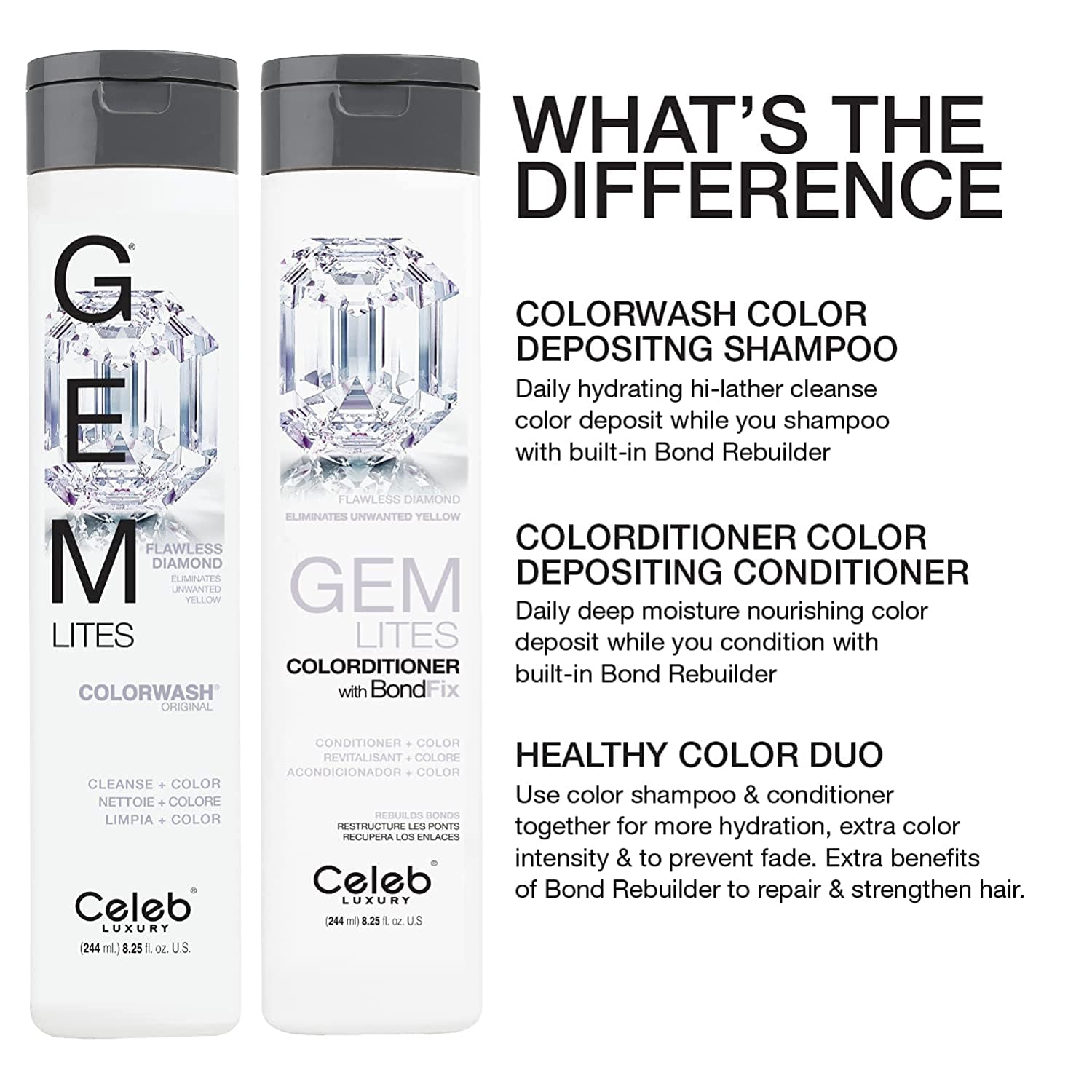 Daily hydrating color depositing shampoos with bond rebuilder. Gem Lites Colorwash is a shampoo color line that can be used with natural hair color tones and salmon-colored hair. The product is designed to instantly add color while cleansing, maintaining, and boosting color. Use this shampoo line instantly after getting your hair done, and it is proven to stop fading.