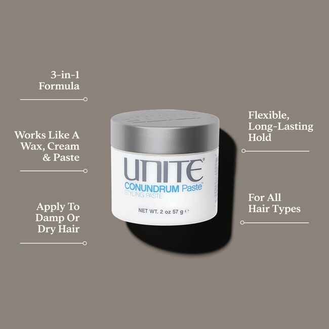 Wax, paste or cream? CONUNDRUM Paste makes the answer easy… all of the above. This styling cream boasts the benefits of a wax, paste, and cream, all in one magical pot! Create a flexible, long-lasting hold that's messy, sleek or anything in between. Use on wet or dry hair.